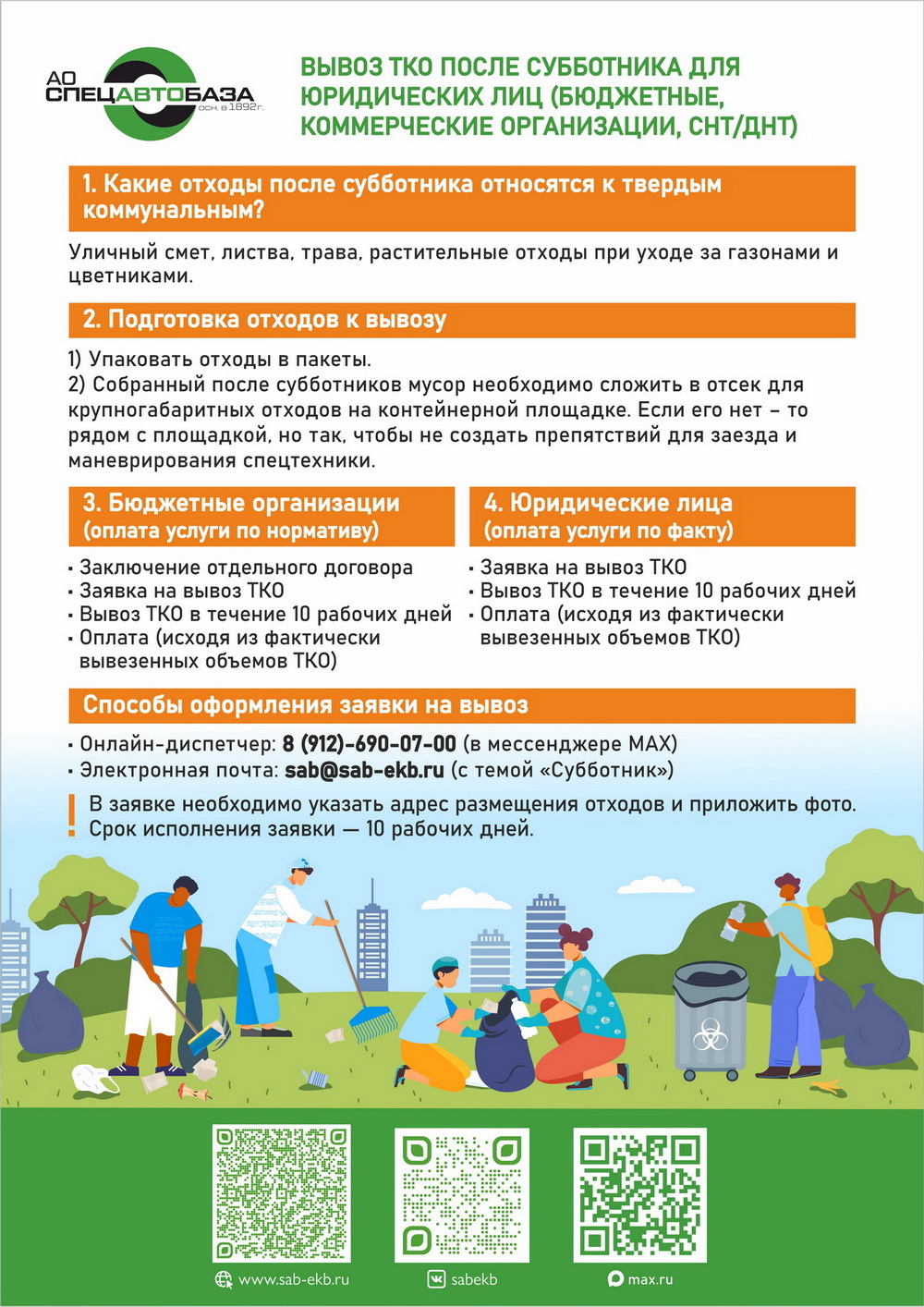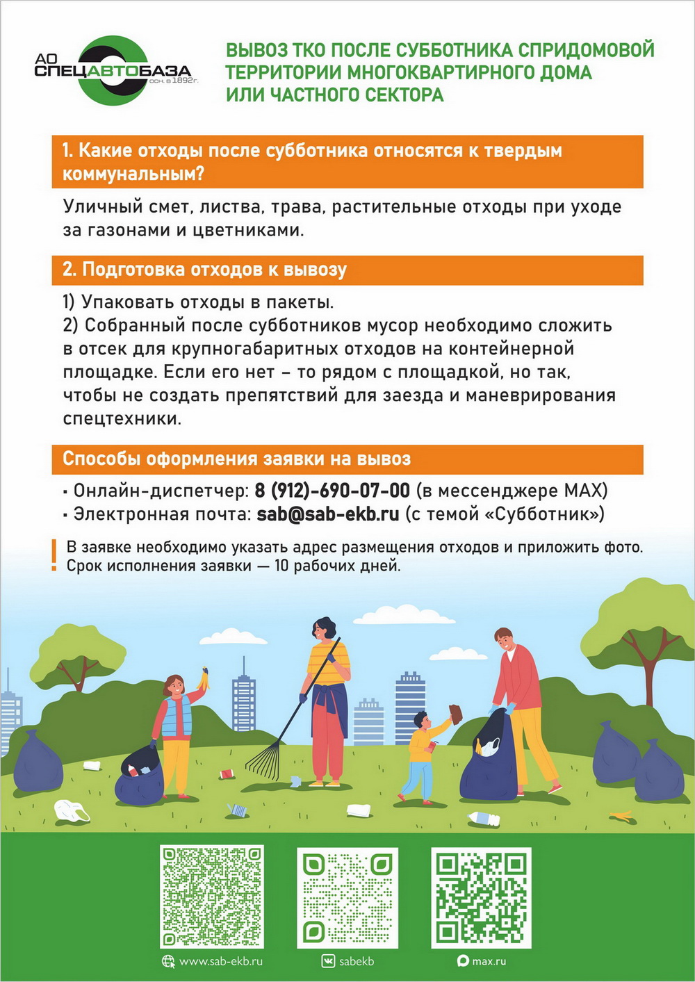 До начала транспортирования, ТКО, образовавшиеся в результате проведения субботников (уличный смет, листва, трава, растительные отходы при уходе за газонами и цветниками) необходимо упаковать в пакеты и разместить в отсек, предназначенный для крупногабаритных отходов на контейнерной площадке. При отсутствии такого отсека, ТКО необходимо складировать возле контейнерной площадки таким образом, чтобы оставалось пространство для заезда и маневрирования специализированного автотранспорта.